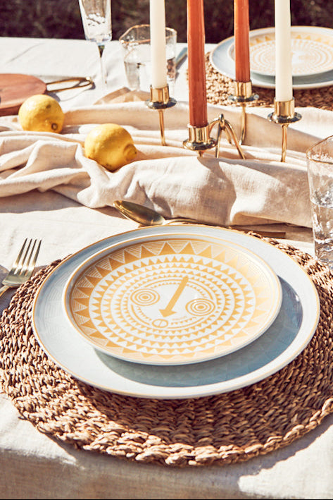 WELI extends the artistic universe of WURO into a functionalBC-friendly tableware expression. Inspired by Burkina Faso sun masks - spiritual emblems of the Bwa culture - each plate becomes a symbolic imprint for everyday life, designed to illuminate spaces and connect cultures. The central solar motif is elevated by a hand-painted gold rim, a signature detail that brings warmth, radiance, and modern elegance to the table.